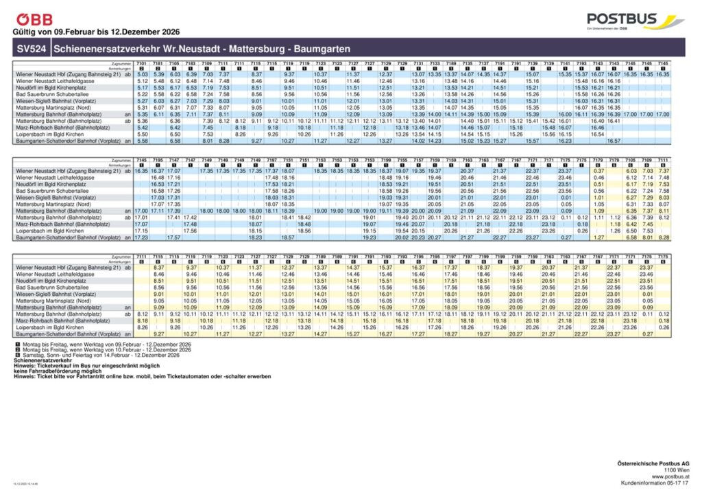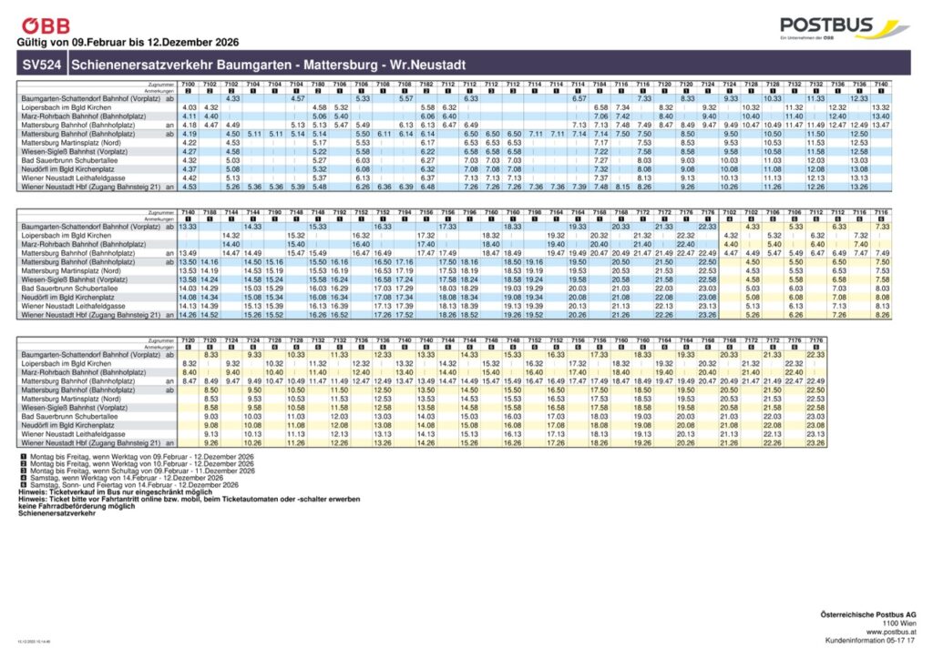 - Zwischen Loipersbach-Schattendorf und Baumgarten-Schattendorf: Hier erfolgt die Ersatzbeförderung mit Bussen.